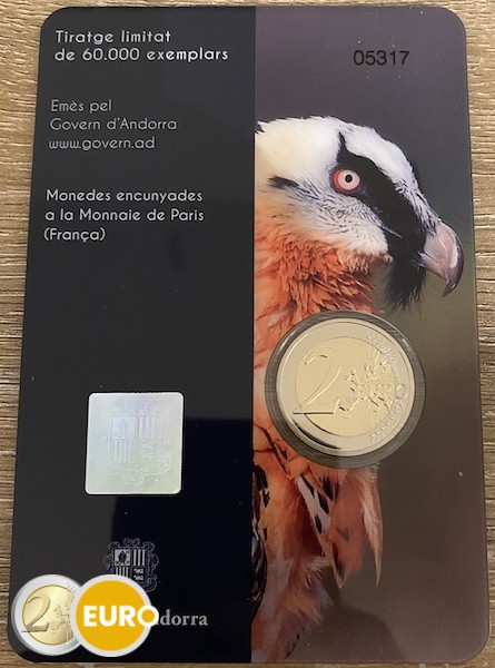 Deze munt is opgedragen aan de lammergier (Gypaetus barbatus), een van de meest emblematische vogels van de Andorrese Pyreneeën. Deze gierensoort, herkenbaar aan het dichte verenkleed en de haakvormige snavel, staat momenteel op de lijst van bedreigde diersoorten. Met deze uitgifte wil Andorra het belang van bescherming en behoud van zijn soort benadrukken.
