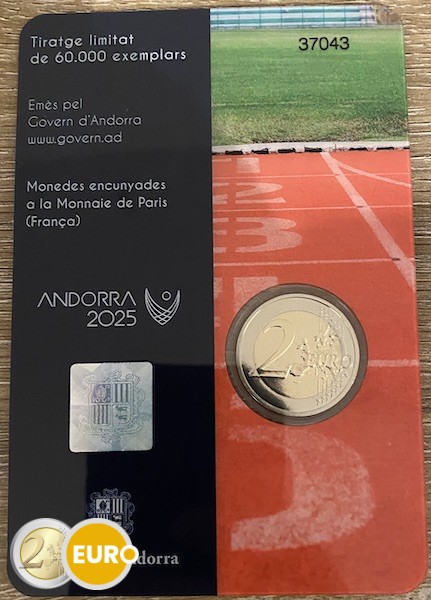 De kern van de munt toont verschillende sportelementen, waaronder ballen van verschillende sporten, met gestileerde netten als achtergrond. Ze hebben allemaal een dynamische stijl die beweging en energie uitstraalt. Bovenaan staat het opschrift “Jocs dels Petits Estats d’Europa” en onderaan staat “ANDORRA 2025”.