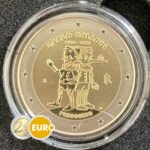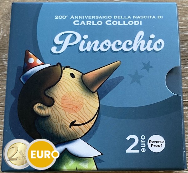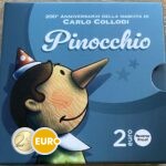 De 2 euro herdenkingsmunt van Italië uit 2026 viert de 200e verjaardag van de geboorte van Carlo Collodi, de Italiaanse schrijver die wereldwijd beroemd werd met het verhaal van Pinocchio. De nationale zijde toont een levendige voorstelling van Pinocchio met zijn karakteristieke lange neus en zijn schaduw die naar de pratende krekel kijkt, een scène die de verbeelding en moraal van het meesterwerk symboliseert. Bovenaan staat “CARLO COLLODI” met de jaartallen “1826 – 2026”, en onderaan verschijnt het woord “PINOCCHIO”. Deze munt brengt hulde aan een van de bekendste figuren uit de kinderliteratuur en aan het literaire erfgoed van Italië.