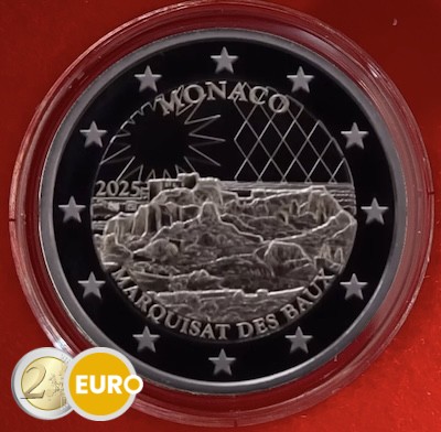 Op de voorzijde staat centraal de beroemde rots van Les Baux-de-Provence (Bouches-du-Rhône) in zijn huidige staat, samen met de omgeving van het dorp Les Baux-de-Provence. Aan de bovenzijde van de munt is de uitgevende staat „MONACO” te zien, rechts vergezeld van een geruit schild en links van de ster die Les Baux symboliseert. Aan de onderzijde zijn de uitgifteaanleiding „MARQUISAT DES BAUX”, het uitgiftejaar „2025” en de munttekens van de Monnaie de Paris en van de algemeen graveur Joaquin Jimenez afgebeeld. Op de buitenste muntring staan de twaalf sterren van de Europese vlag.