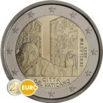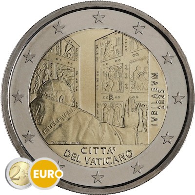 Apertura de la Puerta Santa en la basílica de San Pedro. A la derecha figuran verticalmente la inscripción latina «IVBILAEUM» y el año «2025». En la parte inferior de la moneda aparece el Estado emisor «CITTÀ DEL VATICANO». La marca de ceca «R» de la Casa de la Moneda de Roma está colocada en la puerta. En la parte inferior izquierda figura el nombre de la diseñadora «D. LONGO».
