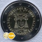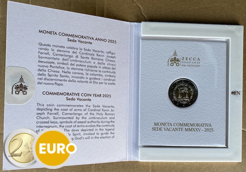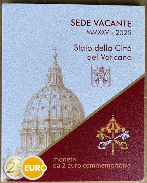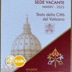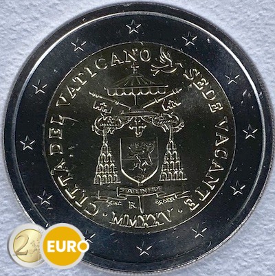 Armoiries du cardinal camérier, le cardinal Kevin Farrell, sous le symbole de la Chambre apostolique, représenté par deux clés croisées sous un parasol basilical. Sur le bord gauche figure l’État émetteur « CITTÀ DEL VATICANO », sur le bord droit l’occasion de l’émission « SEDE VACANTE » et en bas l’année en chiffres romains « MMXXV ». En haut à droite du motif, une colombe portant un rameau d’olivier interrompt l’inscription circulaire. Le différent monétaire « R » de l’atelier de Rome se trouve sous les armoiries du cardinal camérier, accompagné du nom du graveur à gauche et du sigle de la dessinatrice « O. ROSSI » à droite.